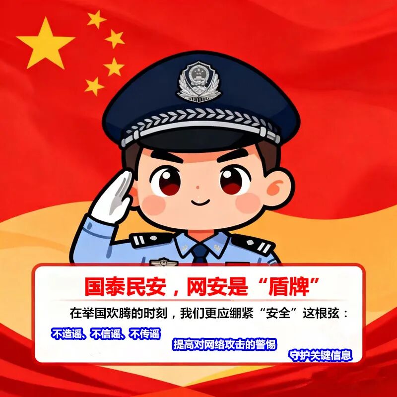 当千家万户的灯火因团圆而明亮,当神州大地因庆典而欢腾,让我们将网络安全内化于心、外化于行。用清醒的头脑构筑防火墙,用良好的习惯打造金钟罩。唯有如此,我们方能在数字时代安然享受“天涯若比邻”的便捷,才能让每一次点击、每一次分享都充满安心与喜悦。