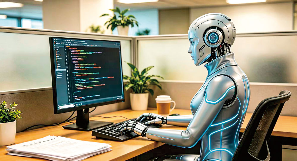 人工智能机器人正在电脑前工作。(AI生成图片)