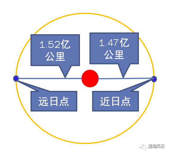 近日点和远日点之间的距离差异只有大约三百万英里,只是日地之间的平均距离9300万英里的一小部分,微不足道。大致如下图:
