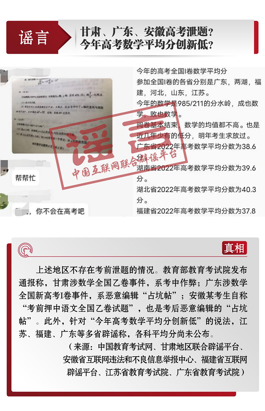 涉高考高招不实信息较为集中,部分谣言诈骗风险高。6月初,一年一度的全国高考如期而至,各地涉高考类话题成为舆论场新热点。“某地高考数学泄题”“父母失信会影响子女上大学”“付费可提前查分”等网络谣言趁虚而入。经查证,网上涉高考高招谣言多为旧谣新炒,别有用心者利用家长、考生们普遍存在的焦虑心理,编造所谓“命题专家”“内部指标”“百分百保上”等系列“话术”,其目的是骗取家长和考生钱财,每年都有家长和考生因此个人信息被泄露、钱财受损失,甚至贻误考生未来发展。7月份进入考生填报志愿、学校分批次录取阶段,广大考生家长一定要擦亮眼睛,从正规渠道了解招生信息,谨防上当受骗。
