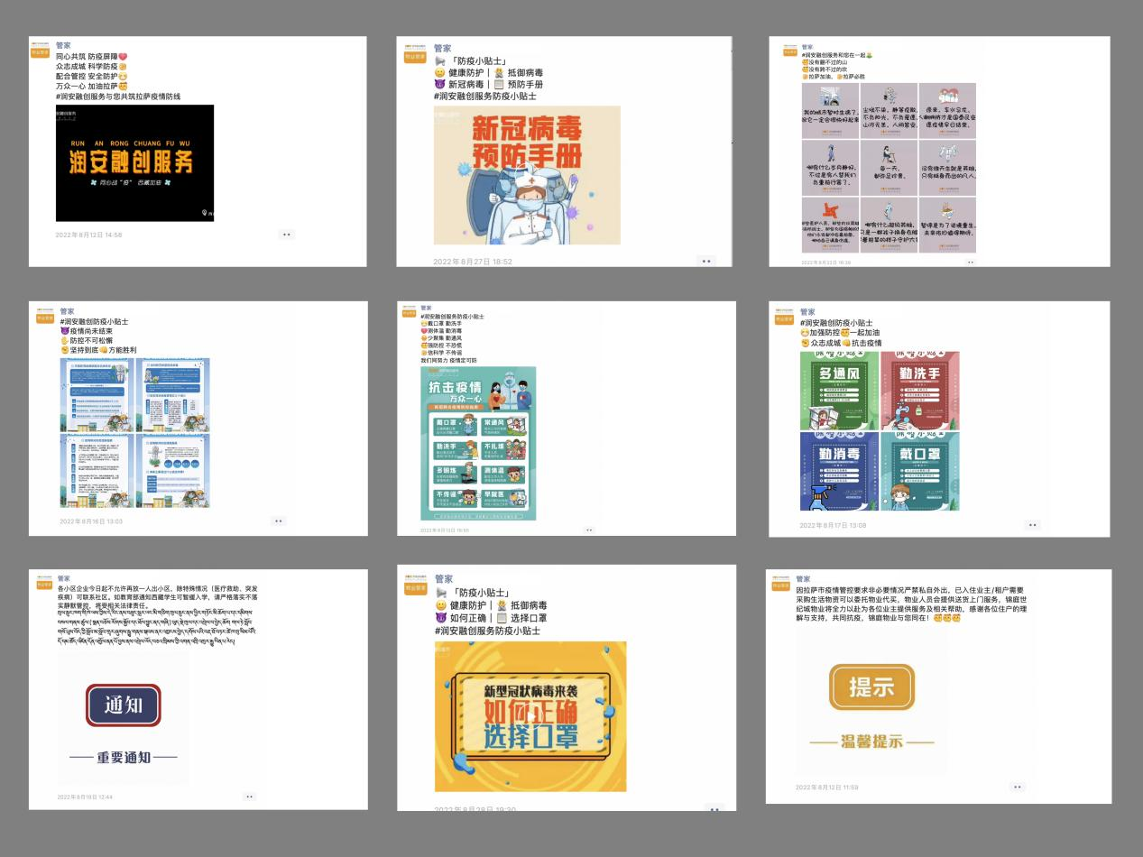 为增强社区居民防护意识和能力,润安融创服务持续开展了疫情防控宣传、线上线下同步宣传防疫知识,引导居民提高防护意识;针对消杀规范、个人防护要点等内容进行图片、文字、视频的全面进行科学防疫科普宣传。