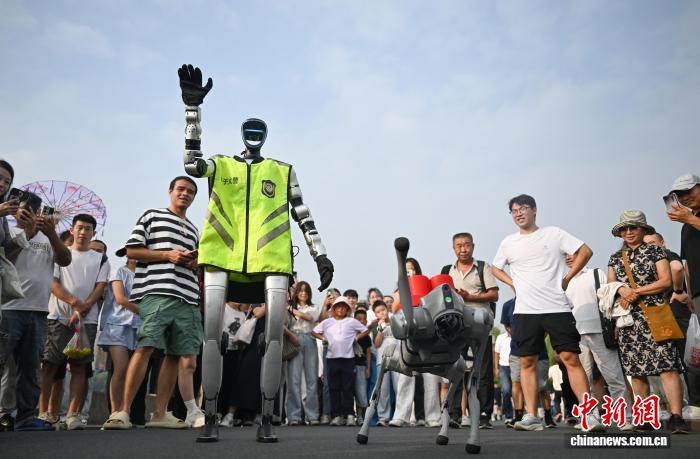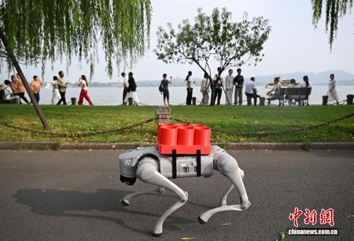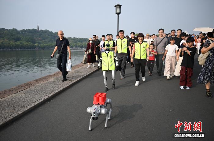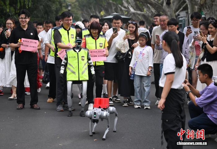 10月1日,“机器人义警”在平湖秋月附近巡逻。当日,浙江杭州西湖迎来“双节”客流高峰,由人形机器人和四足机器狗等组成的“义警队”在平湖秋月、白堤等景点开展巡逻和反诈宣传,颇具科技感的AI警队吸引游客关注。中新社记者 王刚 摄