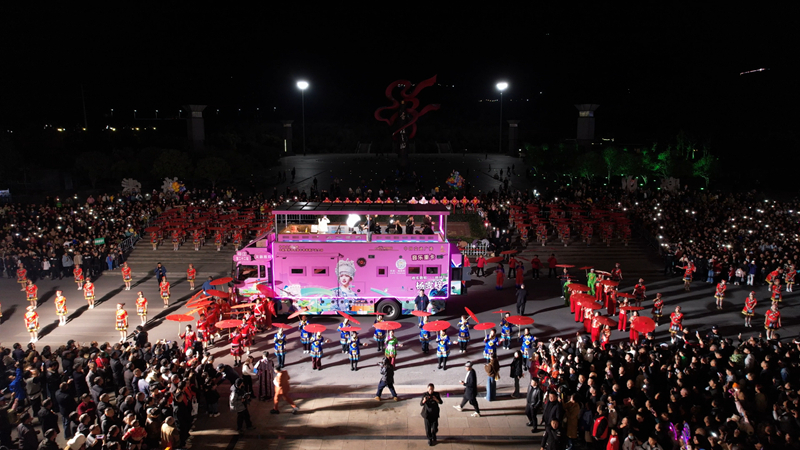 在环形天桥互动点位,锣鼓声渐次响起,队员们两两配合,头顶板凳龙来回穿梭、上下舞动,灵动翻飞如活龙跃动,腾挪似惊雷破阵,引得市民游客纷纷驻足欢呼、拍照留念,快门声与喝彩声交织成一片热闹盛景。“板凳龙是我们印江的宝贝,夜里表演更有氛围。”板凳龙表演领队杨恩慧对着镜头介绍说,“希望非遗借网络东风,走出大山,让更多人感受印江的非遗魅力。”