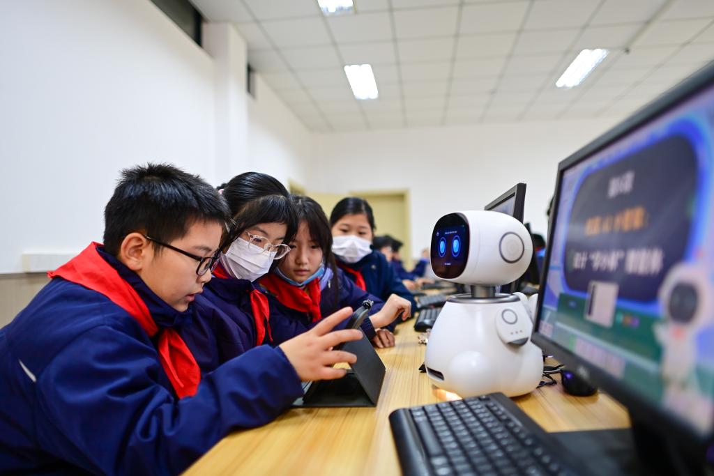 2025年12月5日,杭州市钱塘区学林小学的学生在人工智能通识课上对人工智能机器人进行编程。新华社记者 江汉 摄