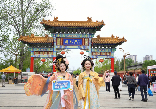 菏泽被誉为“牡丹之都”,曹州牡丹园是当地标志性的赏花胜地。园区占地1600余亩,汇集1280个牡丹品种、九大色系、十大花型,是世界上种植面积最大、品种最多的牡丹园。随着2026世界牡丹大会、第35届菏泽国际牡丹文化旅游节启幕,这里再度成为全国春日赏花焦点。景区精心打造牡丹艺术餐厅、国花馆AR体验馆、亲子乐园与唐风商亭,游客可以品牡丹宴、赏实景剧。在联通5G技术的加持下,菏泽曹县汉服、演出服产业乘势而上,畅销海内外,客服主播也在直播间带领网友沉浸式领略牡丹盛景与汉服文化魅力。