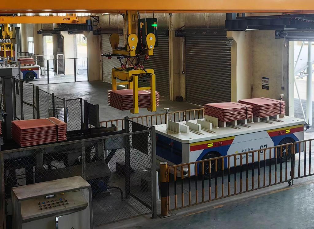 图为金冠铜业分公司电解车间里,正在作业的AGV小车。(吴家富摄)