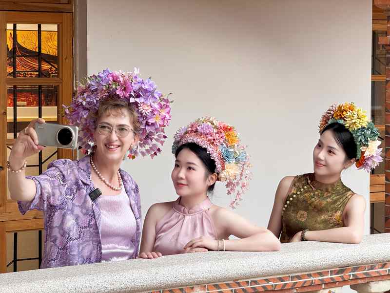 中外游客头戴簪花身穿华服,漫步于泉州古城,感受深厚的文化底蕴。新华网发(林楷煜 摄)
