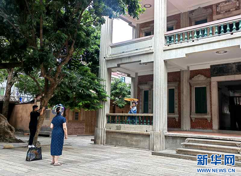 游客在位于泉州市鲤城区花巷89号的傅宅里拍摄写真照。建于1937年的傅宅,是南洋华侨文化与闽南传统建筑碰撞融合的代表。新华网 程立葳 摄