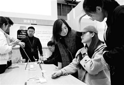 一位参观者(右二)在体验智能手表的腕部动态血压记录仪功能。新华社记者 方喆 摄