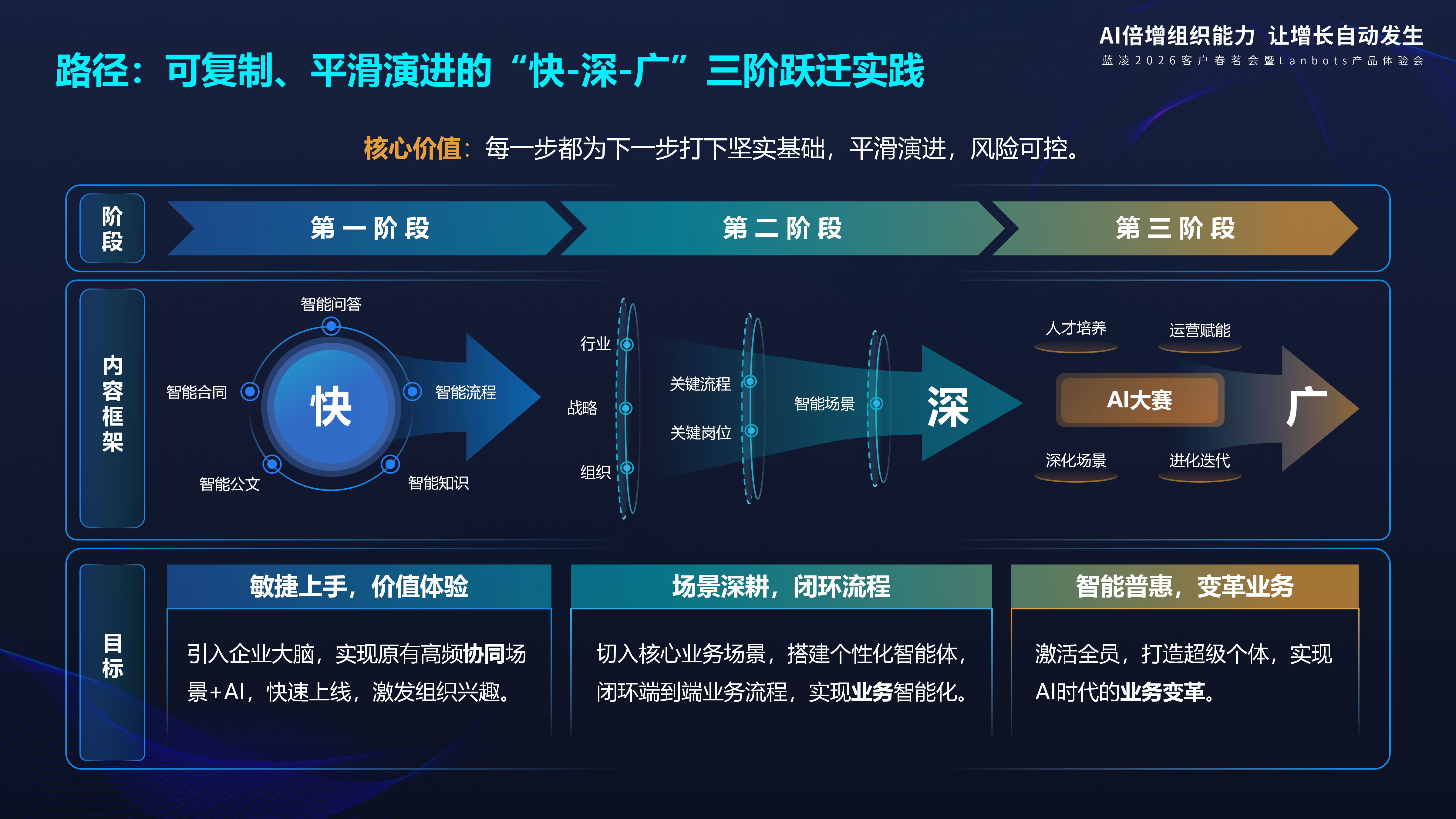 为此,蓝凌智能基于数百个智能体项目,创新推出企业AI进化“快-深-广”新范式,助力企业实现智能体应用的平滑推进及风险可控。