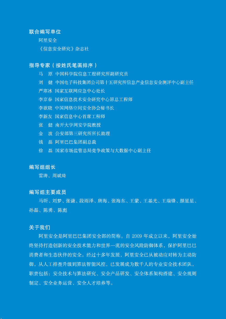 本次白皮书的编写工作得到了业界知名专家的大力支持。中国科学院信息工程研究所副研究员马原、中国电子科技集团公司第十五研究所信息产业信息安全测评中心副主任刘健、国家互联网应急中心处长严寒冰、国家信息技术安全研究中心原总工程师李京春、中国网络空间安全协会秘书长李欲晓、国家信息中心首席工程师李新友、南开大学网安学院教授张健、公安部第三研究所所长助理金波、阿里巴巴集团副总裁钱磊以及国家市场监管总局竞争政策与大数据中心副主任徐磊作为白皮书的指导专家,对编撰工作进行了指导,并对典型案例进行了深度剖析。