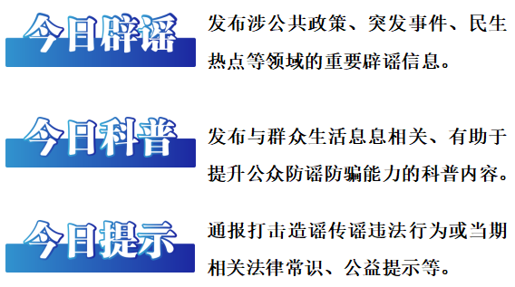 据悉,“今日辟谣榜”旨在传递事实真相,传播科学知识,帮助公众获得权威、准确的真实信息。栏目设置“今日辟谣”“今日科普”及“今日提示”三大版块,每日聚焦群众关心关切的重要辟谣内容,对涉及公共政策、突发事件、医疗健康等领域的网络谣言及时回应。