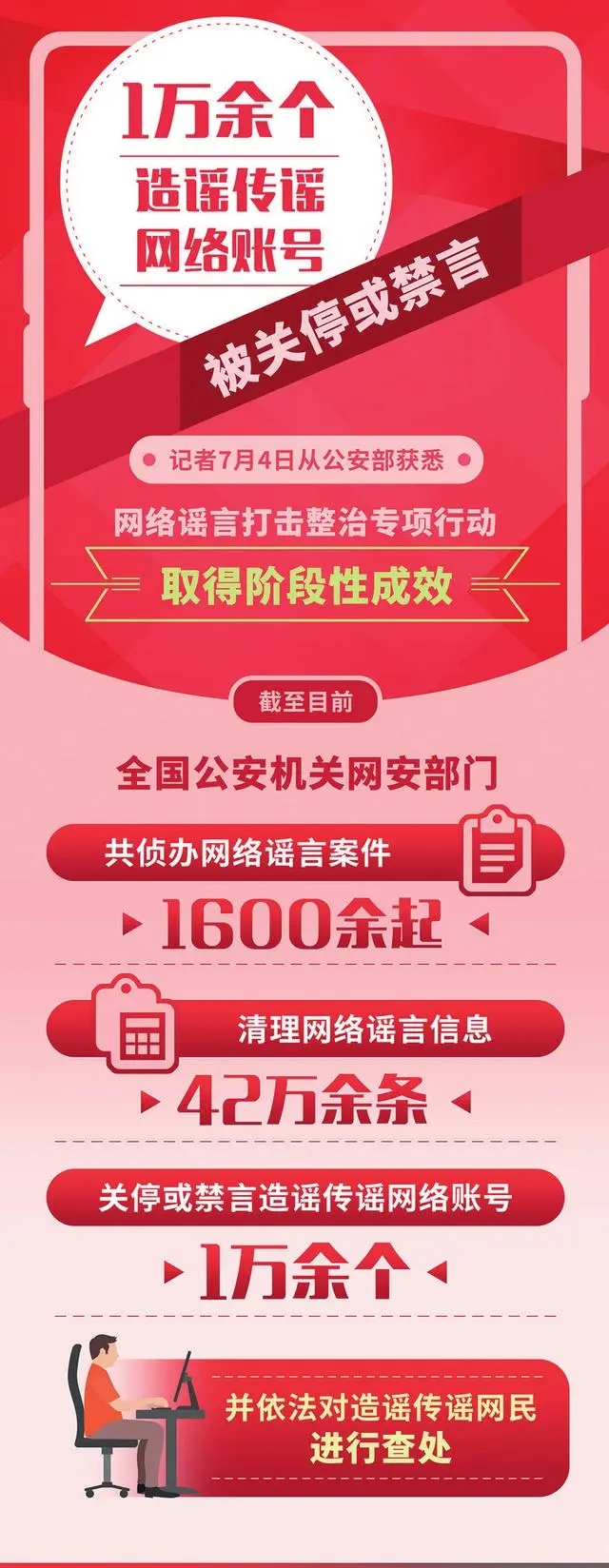 自今年4月网络谣言打击整治专项行动开展以来,全国公安机关网安部门已侦办网络谣言案件1600余起,清理网络谣言信息42万余条,关停或禁言造谣传谣网络账号1万余个,并依法对造谣传谣网民进行查处。