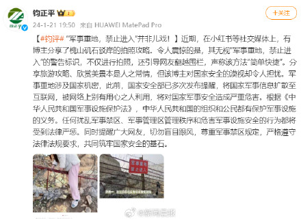 博主引导网友翻越禁区围栏 钧正平发声:“军事重地,禁止进入”并非儿戏!