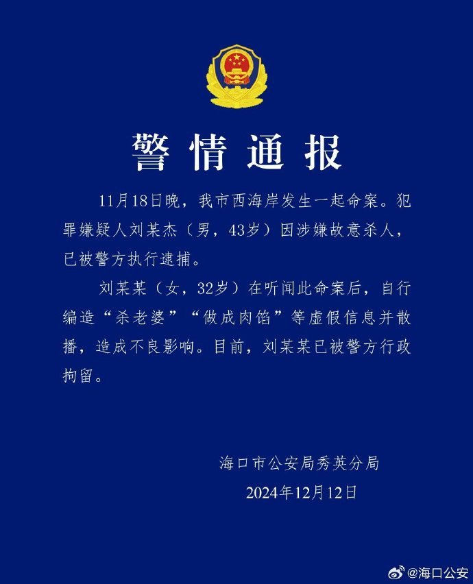据海口公安微博消息,海口市公安局秀英分局12日发布警情通报,11月18日晚,海口市西海岸发生一起命案。犯罪嫌疑人刘某杰(男,43岁)因涉嫌故意杀人,已被警方执行逮捕。刘某某(女,32岁)在听闻此命案后,自行编造虚假信息并散播,造成不良影响。目前,刘某某已被警方行政拘留。