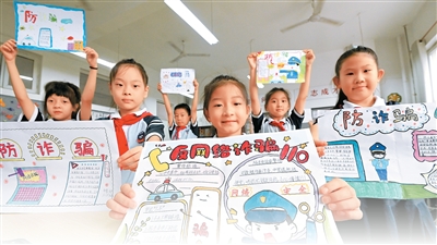 河北省邯郸市复兴区阳春小学的学生们展示网络安全主题手抄报。