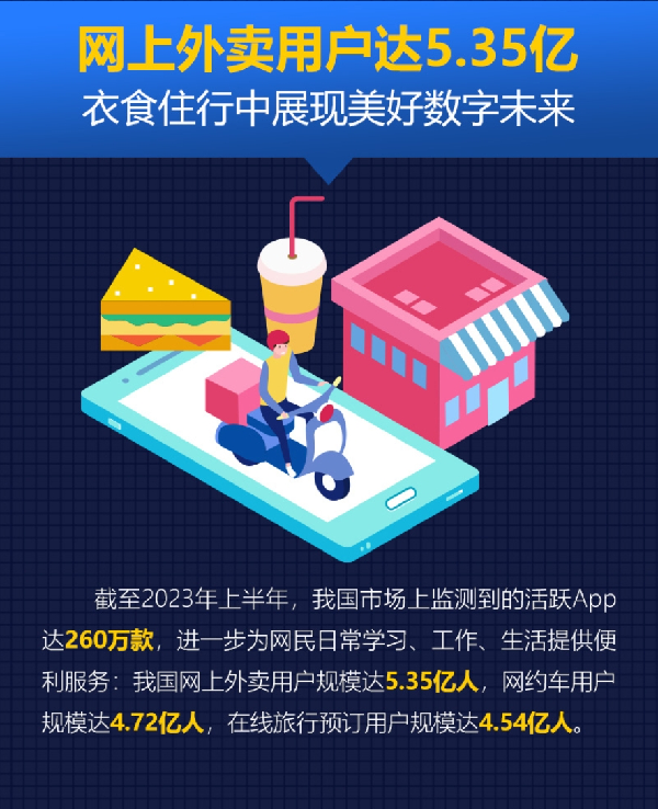 截至2023年上半年,我国市场上监测到的活跃App达260万款,进一步为网民日常学习、工作、生活提供便利服务:我国网上外卖用户规模达5.35亿人,网约车用户规模达4.72亿人,在线旅行预订用户规模达4.54亿人。(穆子叶)
