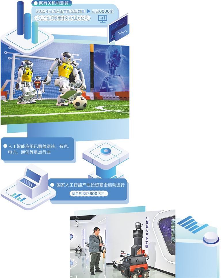 据有关机构测算,2025年我国人工智能企业数量超过6000家,核心产业规模预计突破1.2万亿元。AI手机、AI电脑、AI眼镜等人工智能终端产品加快走进千家万户。人工智能应用已覆盖钢铁、有色、电力、通信等重点行业,逐渐深入产品研发、质量检测、客户服务等重点环节。国家人工智能产业投资基金启动运行,资金规模达600亿元。