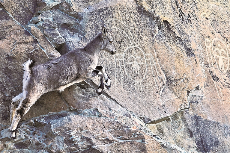 阳光照进寒风凛冽的贺兰山谷,增添了几分暖意。矫健的岩羊在陡峭崖壁上跳跃,偶尔跨过岩石上深凿浅刻的岩画,古老图案仿佛瞬间被唤醒。